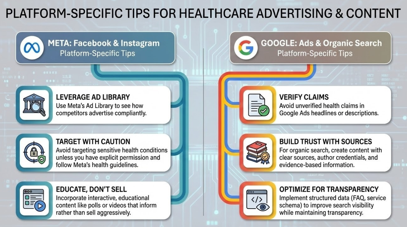 This graphic outlines platform-specific tips for healthcare advertising and content across Meta (Facebook and Instagram) and Google. It emphasizes compliant ad practices, cautious audience targeting, educational content, verified claims, trusted sources, and transparency to improve ad performance and search visibility.