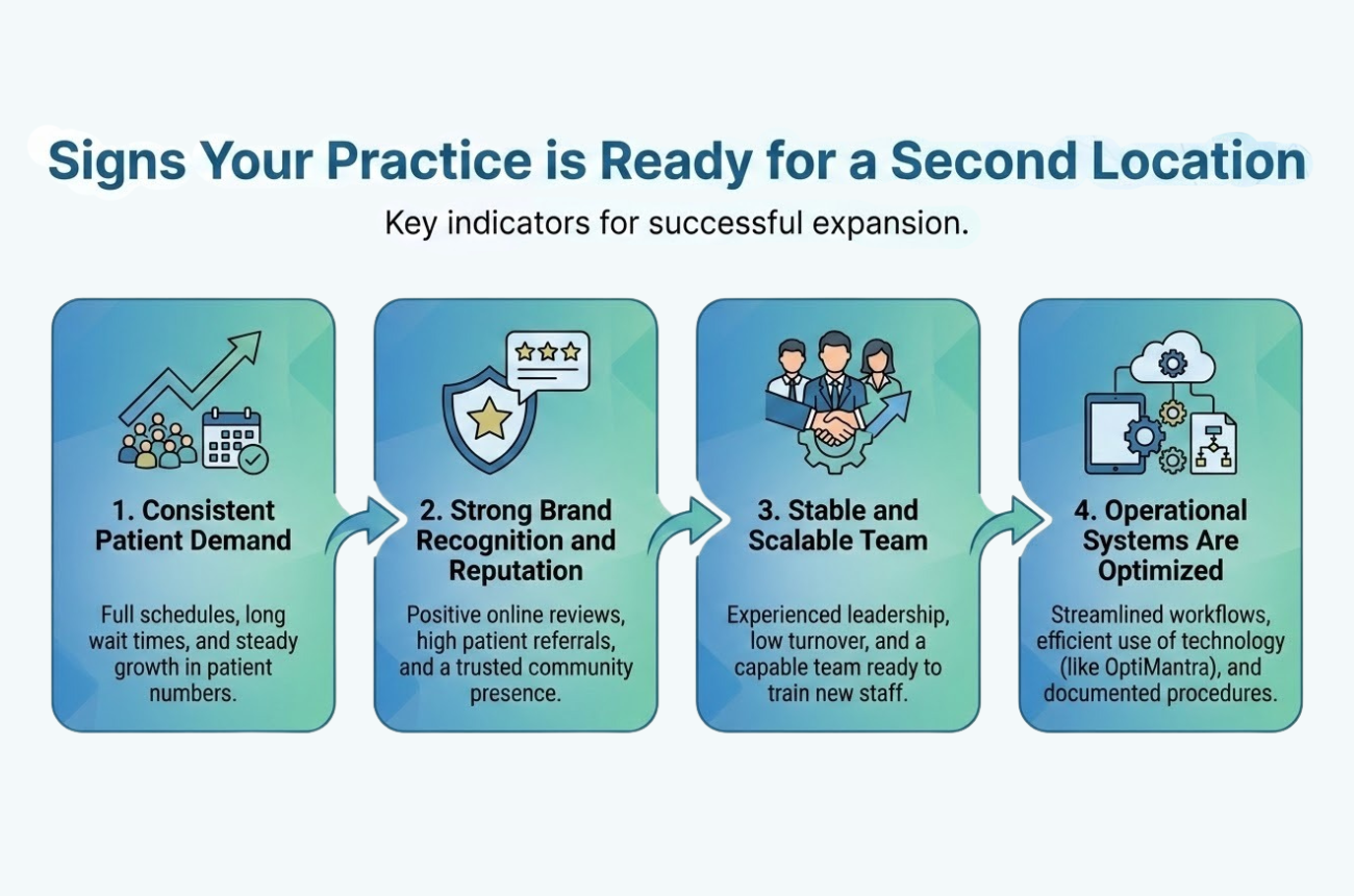 This infographic highlights signs that a healthcare or medical practice is ready to expand to a second location. It lists four key indicators: consistent patient demand, strong brand recognition and reputation, a stable and scalable team, and operational systems optimized with documented processes and technology.